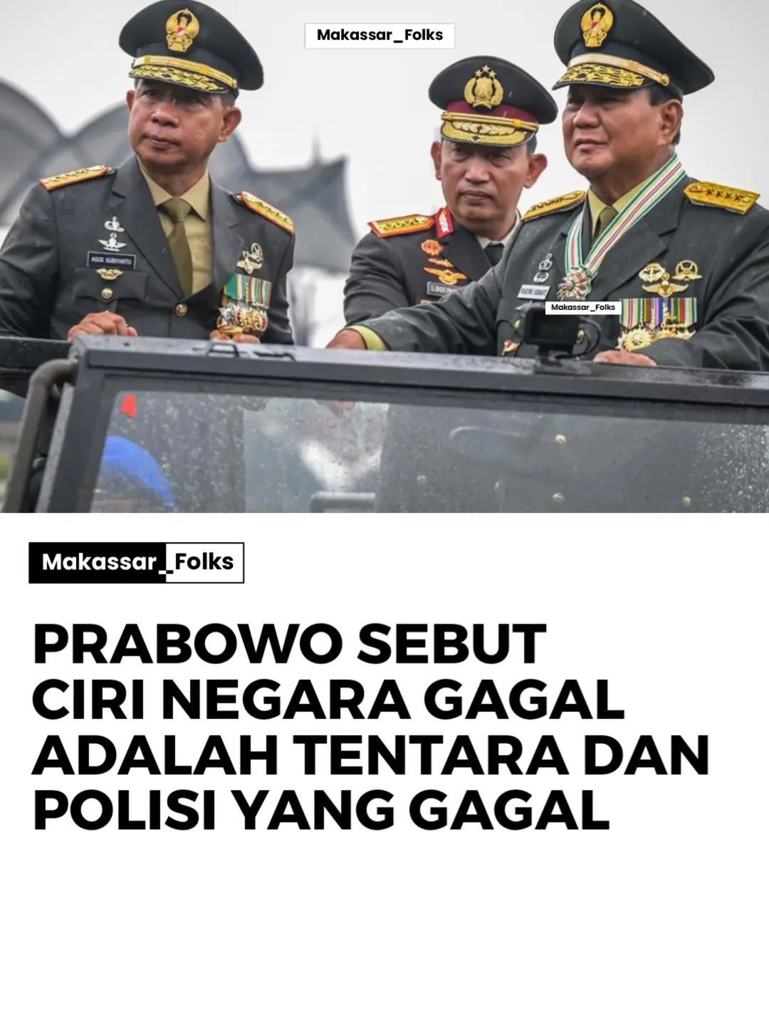 Presiden Prabowo Subianto menekankan ciri khas negara gagal adalah tentara dan polisi yang gagal. Sebab, TNI dan Polri adalah dua institusi yang merupakan wujud dari kehadiran negara, penegakan kedaulatan, dan eksistensi negara.